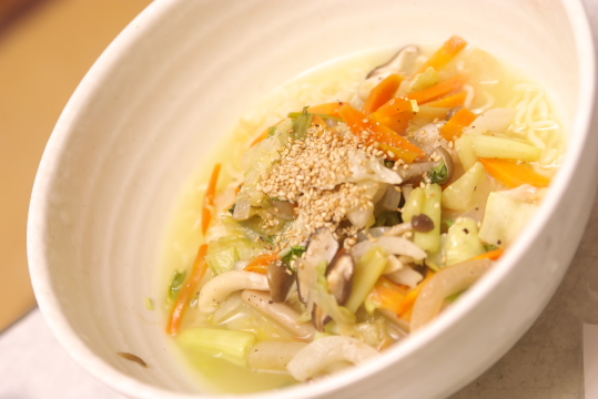 材料:サッポロ一番塩ラーメン、人参、椎茸、ぶなしめじ、玉葱、白ネギ、キャベツ、ごま油、丸鶏がらスープ