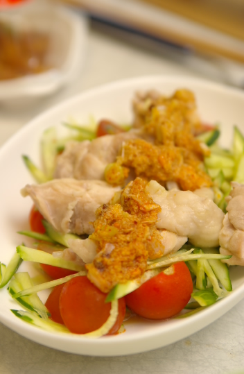材料:鶏もも肉、きゅうり、プチトマト、白ネギ、生姜、にんにく、ごまだれ、ぶっかけおかずラー油
