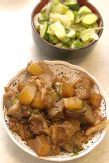 手前:豚ばらとこんにゃくの炒め物(材料:豚ばら、こんにゃく、大根、ししとう、唐辛子、ごま油、醤油、みりん、酒、砂糖、顆粒昆布出汁、柚七味、万能ネギ)