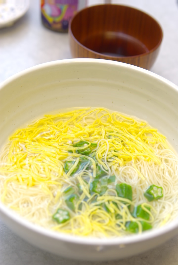 材料:素麺、おくら、錦糸玉子、素麺つゆ、生姜、万能ネギ、炒りごま