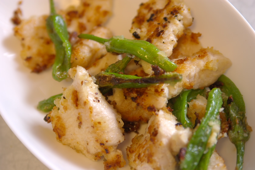 鶏むね肉とししとうにタルタルソースをパン粉をつけて揚げ焼きにしたものガゴ☆