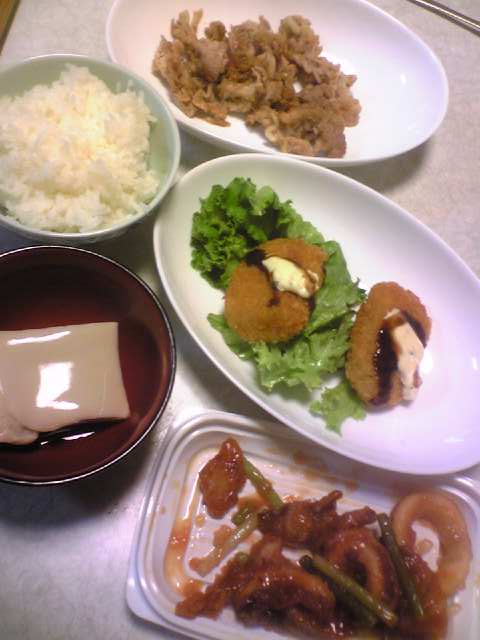 【右上:豚の生姜焼き/右中央:アスパラコロッケ/右下:イカとにんにくの芽のチリソース炒め/左下:ゴマ豆腐】