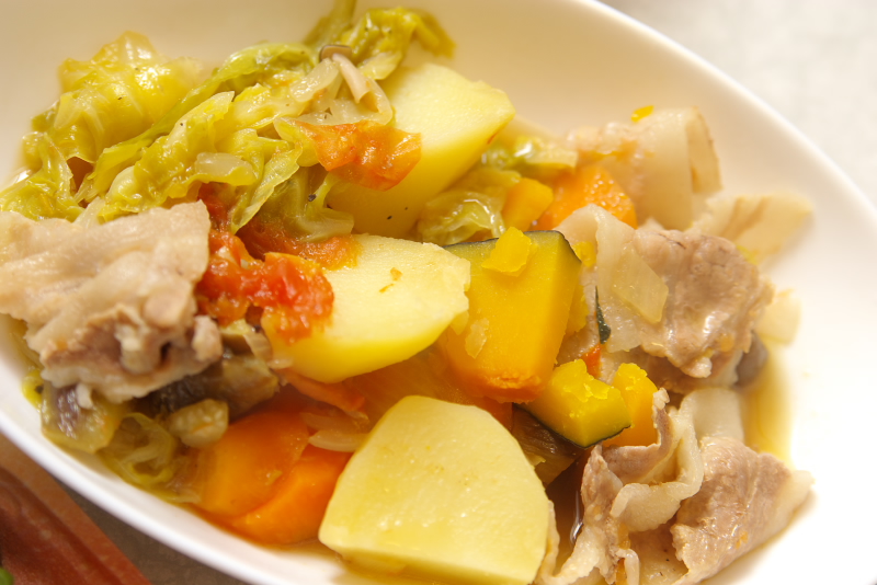 材料:豚バラ肉、キャベツ、ぶなしめじ、玉葱、人参、トマト、南瓜、じゃがいも、バター、コンソメ、ブイヨン、塩、胡椒、水