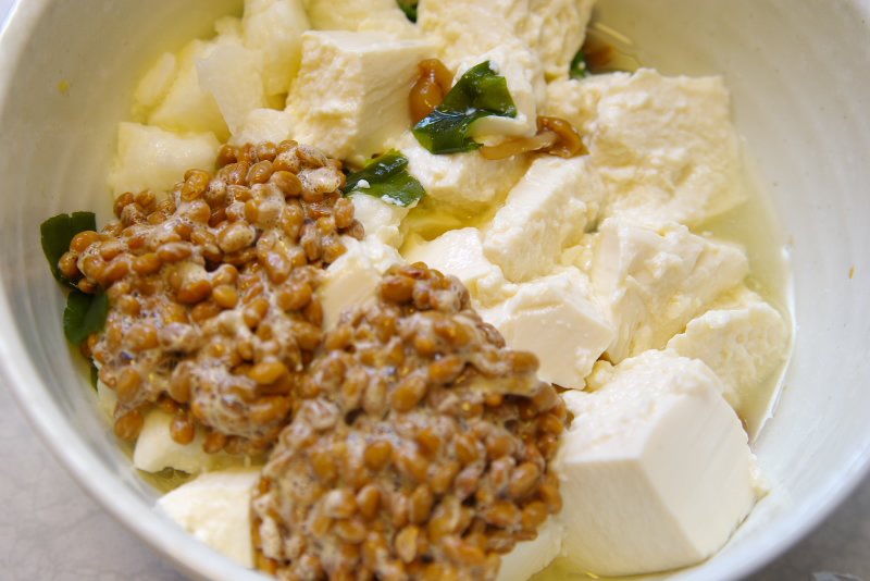 材料:納豆、山芋、おくら、わかめ、なめたけ、豆腐