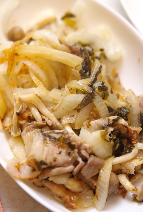 材料:豚バラ肉、玉葱、高菜、ごま油、酒、醤油、塩、七味