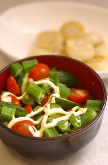 材料:プチトマト、オクラ、薩摩のポンズ、マヨネーズ