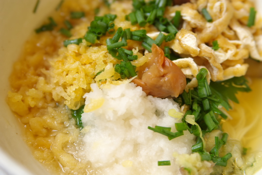 材料:ご飯、てんかす、万能ネギ、ごま油、めんつゆ
