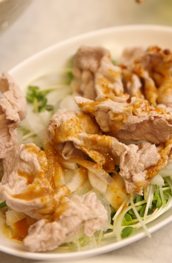 材料:豚肉、こんにゃく、万能ねぎ、唐辛子、ごま油、酒、醤油、砂糖、顆粒昆布出汁、柚七味