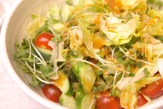奥:サラダ(材料:きゅうり、レタス、プチトマト、玉葱、みょうが、ポンズ)