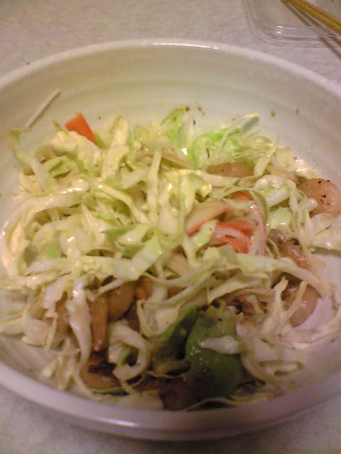 材料:エビ(剥き小エビ1パック)、アボカド(1個)、キャベツ(適量…1/5玉くらい)、かにかま(4本…先日の残り)、醤油(大1)、バター(大1/2)、マヨネーズ、マジックソルト、黒胡椒、オリーブオイル、白ワイン
