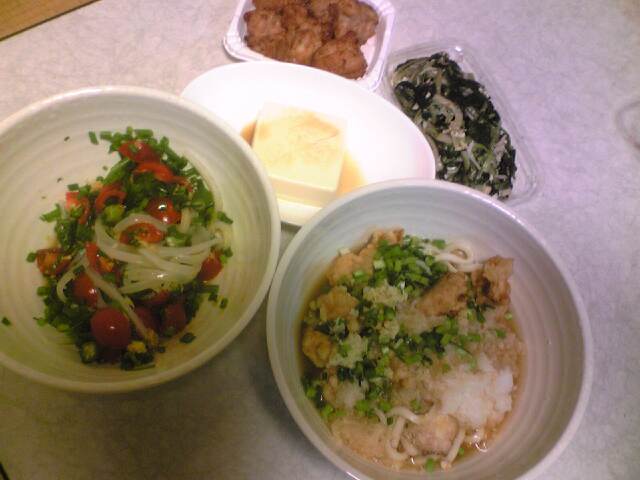 【左:イカとプチトマトとオクラの中華和え/右:鶏てんぶっかけうどん/上:お惣菜たち】