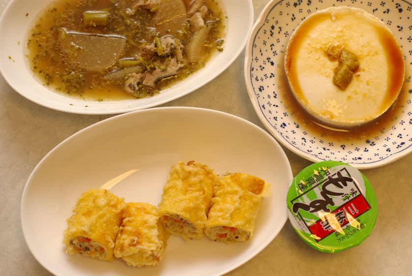 【左上:豚バラ肉と野菜の煮物の残り/手前:春巻きの天婦羅/右上:山芋豆腐/右下:もずく】
