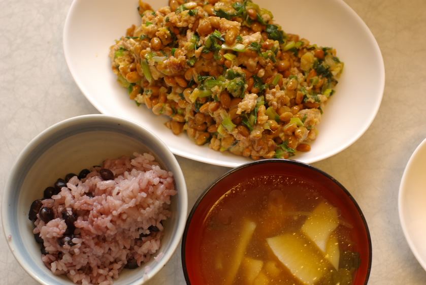 【左下:黒豆御飯/右下:筍と鶏のお吸い物/上:スタミナ納豆】