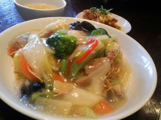 海鮮あんかけ堅焼きそばのセットぴよ。油林鶏と卵スープがついてたピヨ。