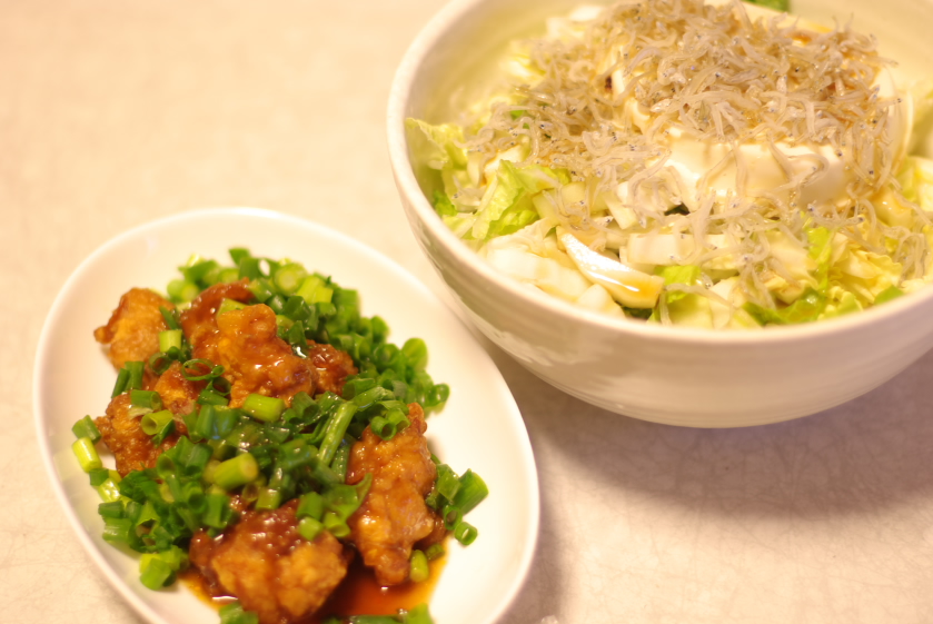 【左:油淋鶏/右:白菜と湯葉豆腐のサラダwithしらす】