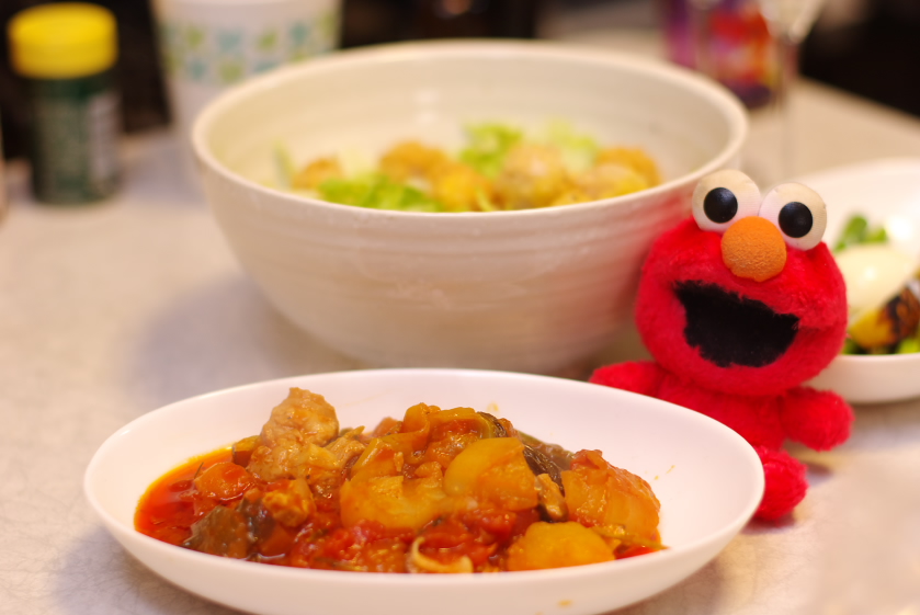 材料:牛モツ、トマト缶(カット)、玉葱、人参、じゃがいも、茄子、セロリ、パプリカ、しいたけ、