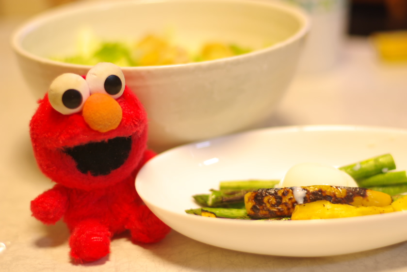 材料:アスパラ、パプリカ、塩、黒胡椒、温泉卵