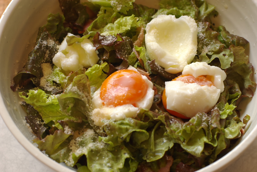 4.サニーレタスとベーコンにAを和えて半熟ゆで卵を落とし、粉チーズをふって出来上がり。