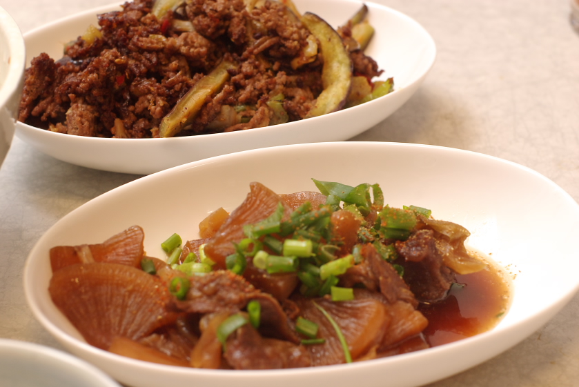 材料:牛スジ(160g)、大根(1/4本)、白ネギ、にんにく(1片)、生姜(少々)、薬味ネギ、一味、山椒
