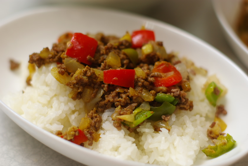 材料:合挽きミンチ(200g)、たまねぎ(1個)、ピーマン(2~3個)、パプリカ(半個)、砂糖(一つまみ)、