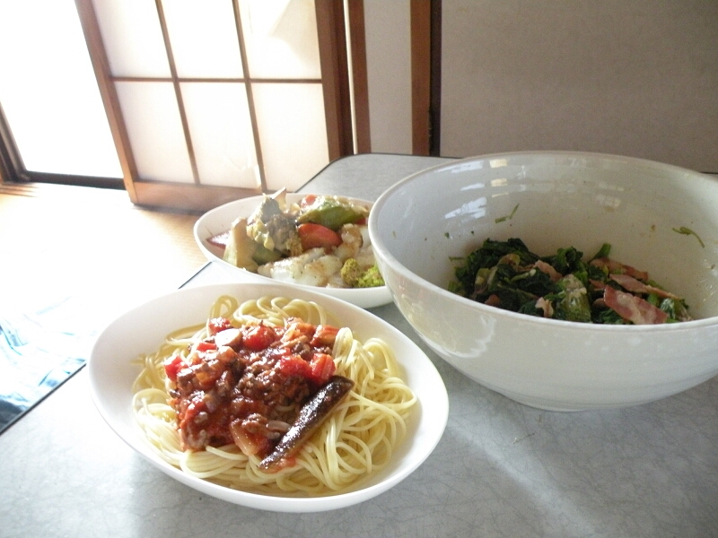 材料:ほうれん草(4株ほど)、ベーコン(4枚)、にんにく(1欠片)、マヨネーズ(大さじ1)、