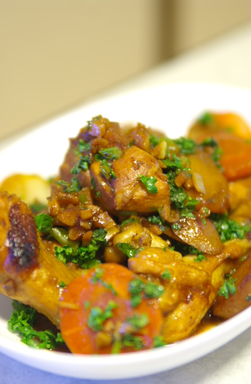 材料:鶏もも肉、手羽元、にんじん、じゃがいも、パセリ、にんにく、レモン、蜂蜜、酢、醤油、酒、砂糖、オリーブオイル