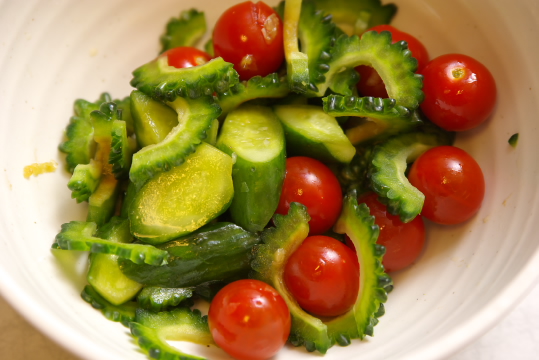 材料:ゴーヤ、プチトマト、きゅうり、出汁醤油、ごま油