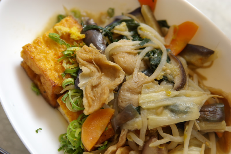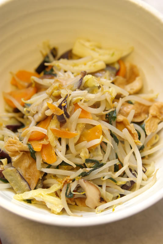 材料:大豆のお肉、キャベツ、もやし、にら、人参、しいたけ、なす、ごま油、醤油、酒、みりん、砂糖、味噌、山椒、柚七味