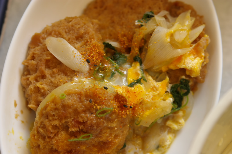 材料:ひれかつ、卵、白ネギ、万能ネギ、玉葱、昆布出汁、湯豆腐のたれ