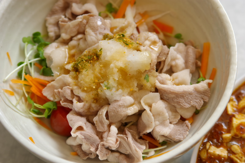材料:豚ばら肉、かいわれ、玉葱、人参、プチトマト、大根おろし、ポンズダレ、柚七味