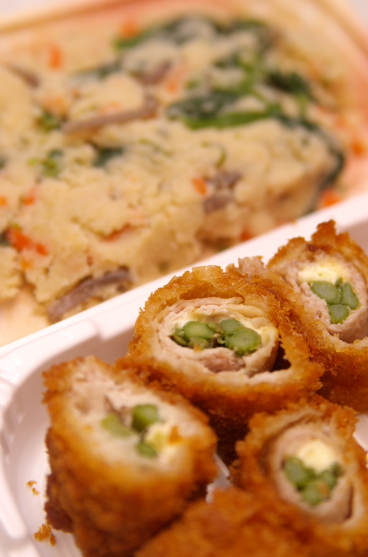 お惣菜の卯の花(奥)とアスパラとチーズの豚肉巻き(手前)ガゴ☆