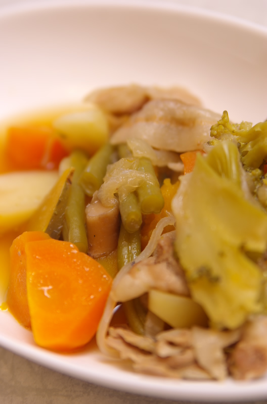材料:豚バラ肉、たまねぎ、人参、じゃがいも、三度豆、ブロッコリー、かぼちゃ、糸こんにゃく、昆布、醤油、酒、みりん、昆布出汁、湯豆腐のたれ、すき焼きのたれ