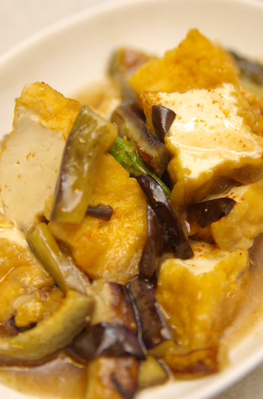 材料:なす、獅子唐、厚揚げ、サラダ油、昆布出汁、水、七味、片栗粉