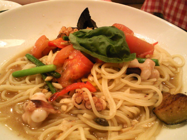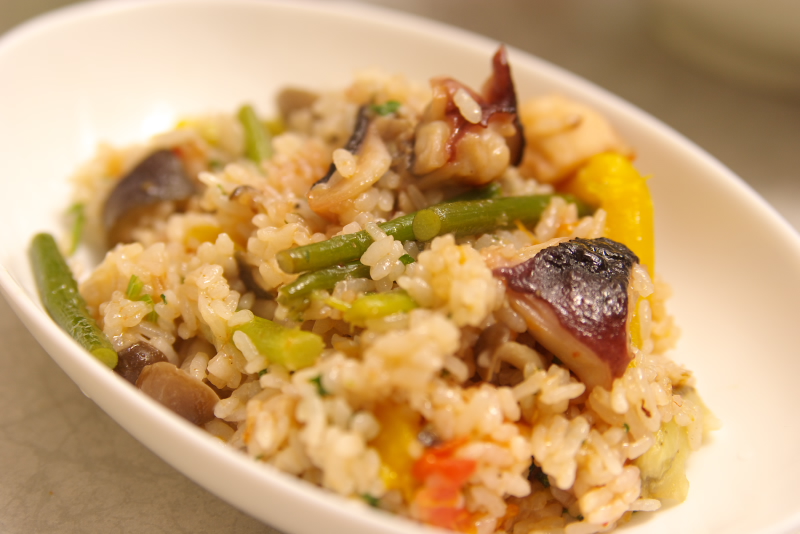材料:ごはん、たこ、トマト、なす、にんにくの芽、ぶなしめじ、セロリ、にんにく、オリーブオイル、バター、鷹の爪、塩、胡椒、パセリ、パスタのためのオイルソース
