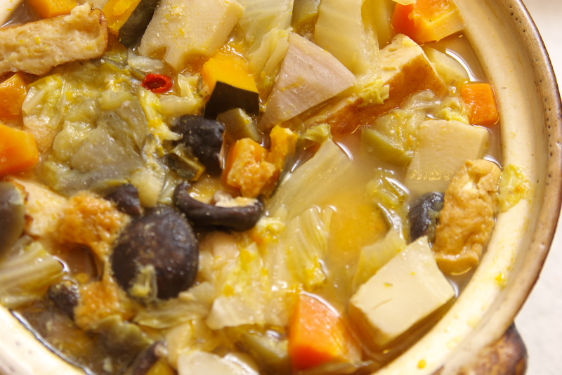 材料:手羽元、白菜、人参、椎茸、じゃがいも、根菜類の水煮、あつあげ、いか天、唐辛子、味噌、醤油、酒、みりん、昆布出汁、出汁昆布、湯豆腐のたれ