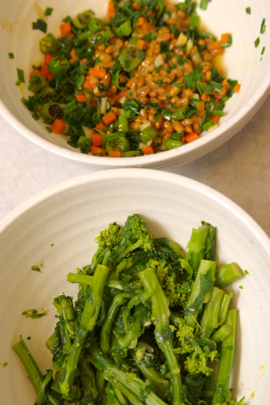 上:スタミナ納豆(材料:納豆、ししとう、人参、万能ネギ、生姜、ごま油、酒、醤油、みりん、タバスコ)