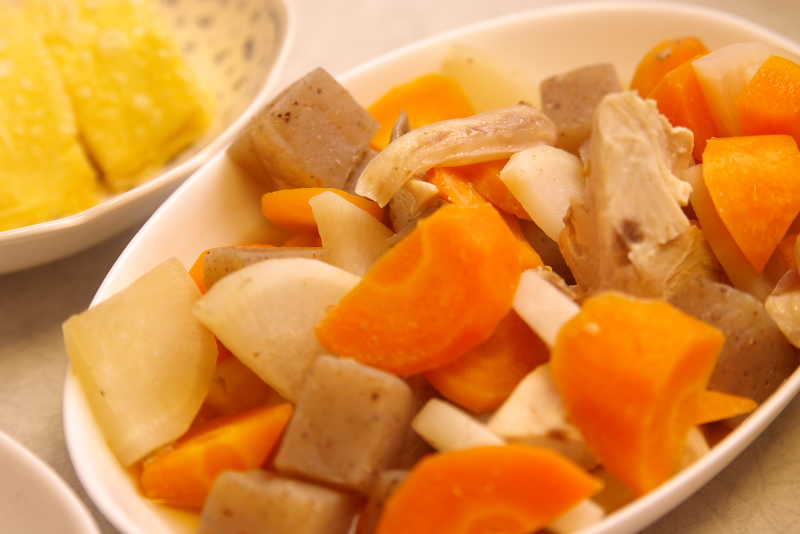 材料:ブリ、人参、大根、こんにゃく、鷹の爪、醤油、砂糖、みりん、酒