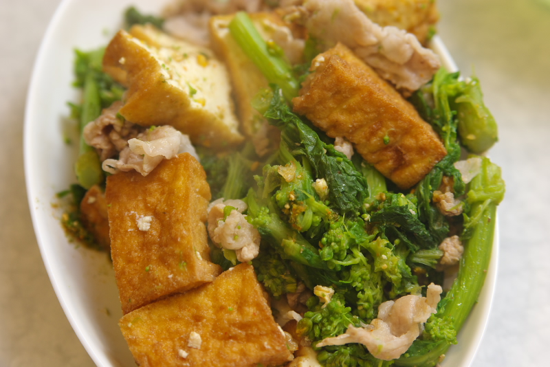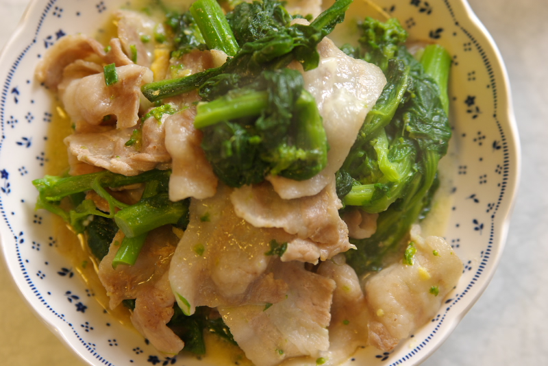 豚バラと菜の花のからしマヨ醤油炒めガゴ。