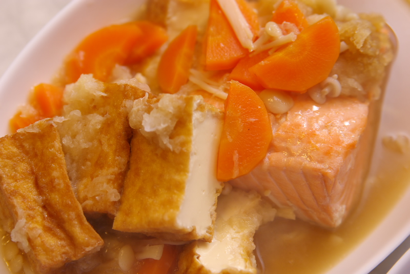 材料:鮭、厚揚げ、人参、大根、しめじ、酒、醤油、みりん、湯豆腐のたれ