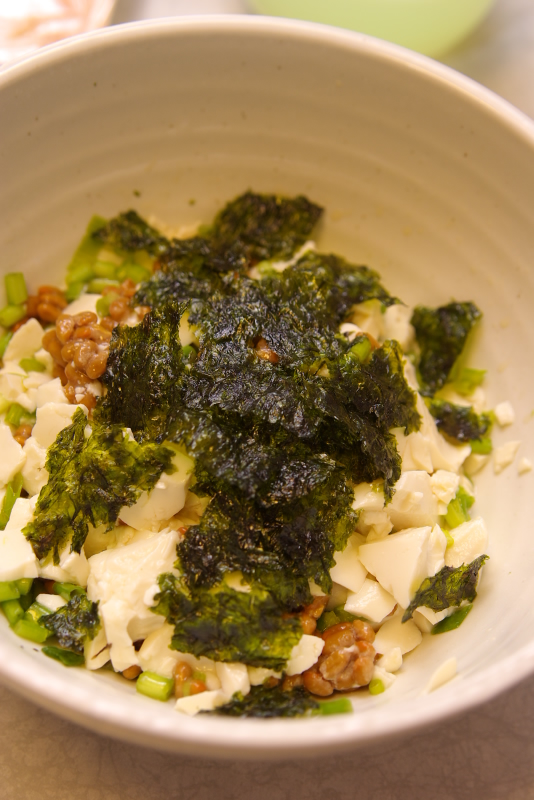 材料:豆腐、納豆、韓国のり、万能ネギ、ごま油
