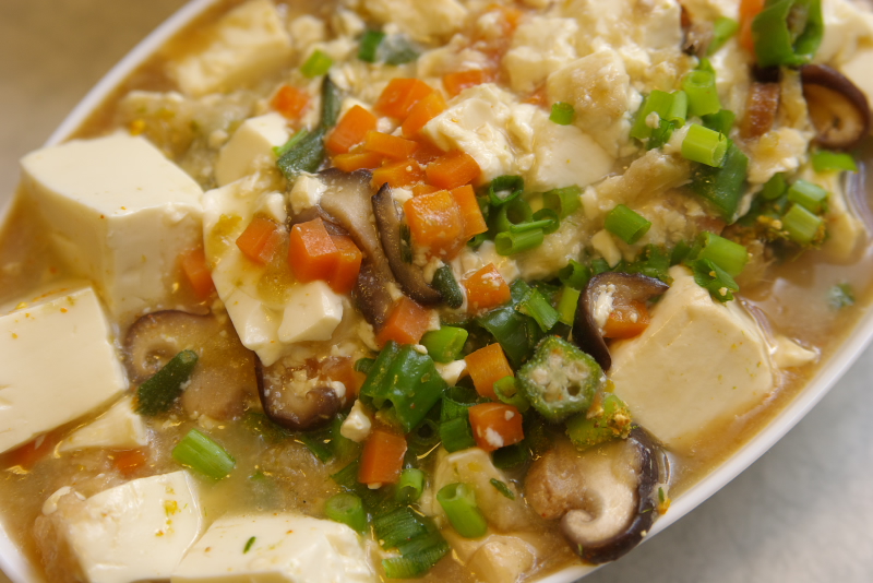 材料:豆腐、人参、椎茸、おくら、ししとう、じゃがいも、万能ネギ、生姜、ごま油、醤油、みりん、酒、山椒、七味、柚七味、柚胡椒、湯豆腐のたれ