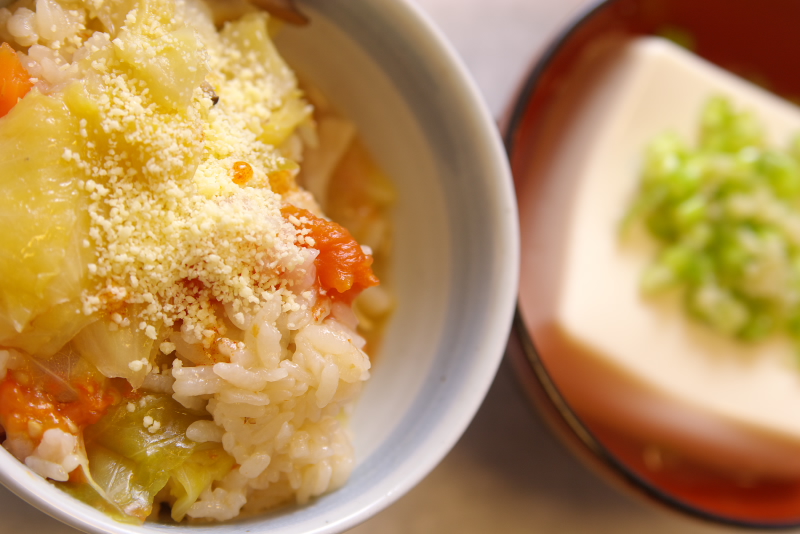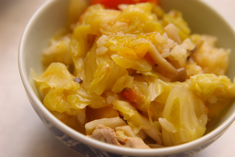 左:リゾット(材料:豚バラ肉、キャベツ、トマト、なす、ぶなしめじ、南瓜、バター、コンソメ、ブイヨン、塩、胡椒、ご飯、水)