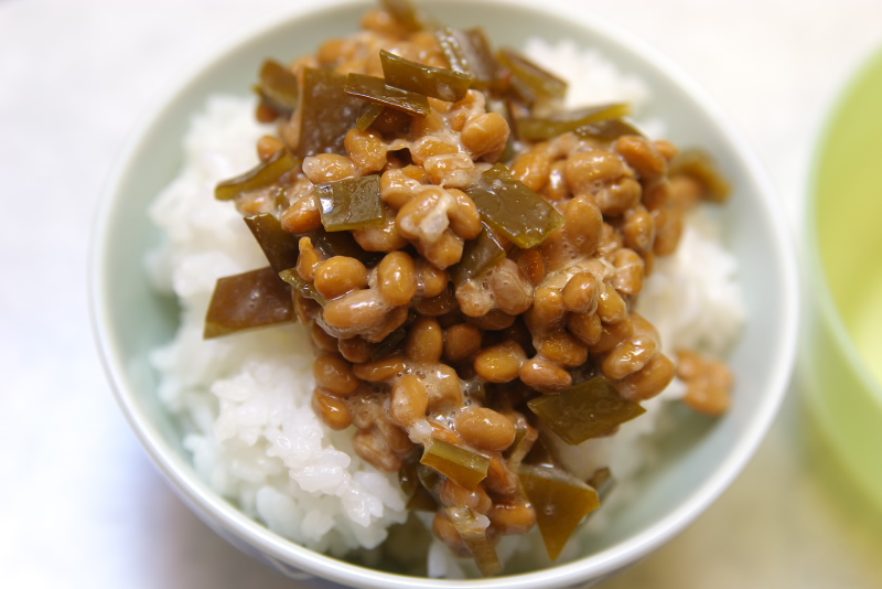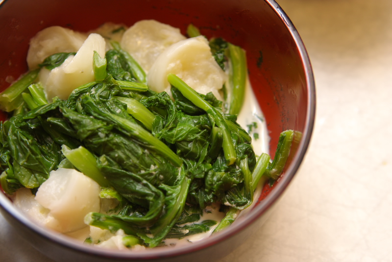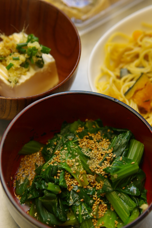 手前:小松菜のおひたし(材料:小松菜、顆粒昆布出汁、ポンズ、ごま油、炒りゴマ)