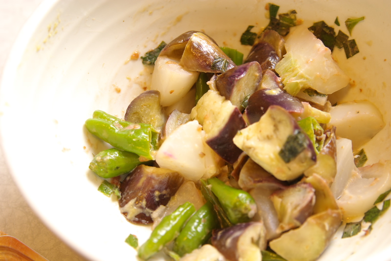 材料:なす、小かぶ、ししとう、大葉、ごま油、酒、醤油、マヨネーズ、山葵、練り梅