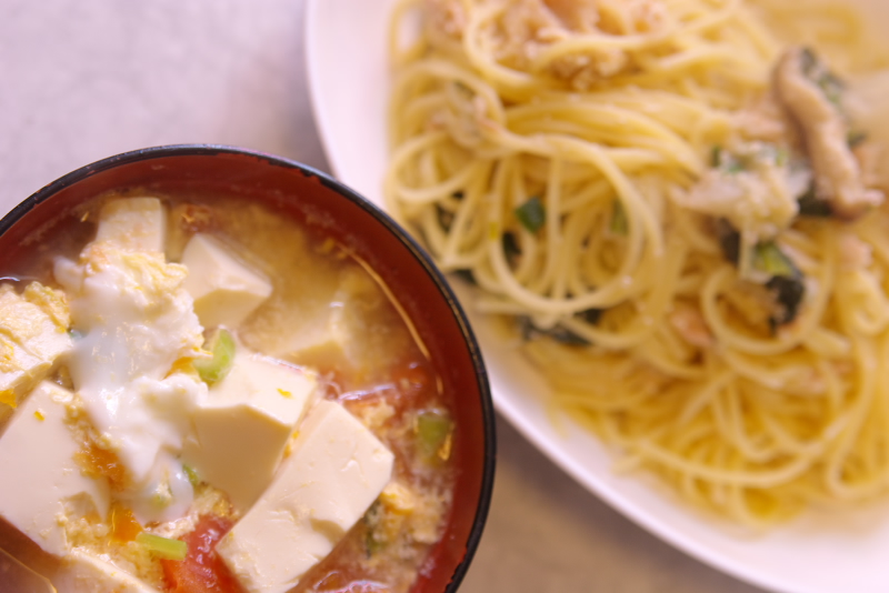 材料:トマト、小かぶの葉、豆腐、卵、水、酒、醤油、昆布出汁