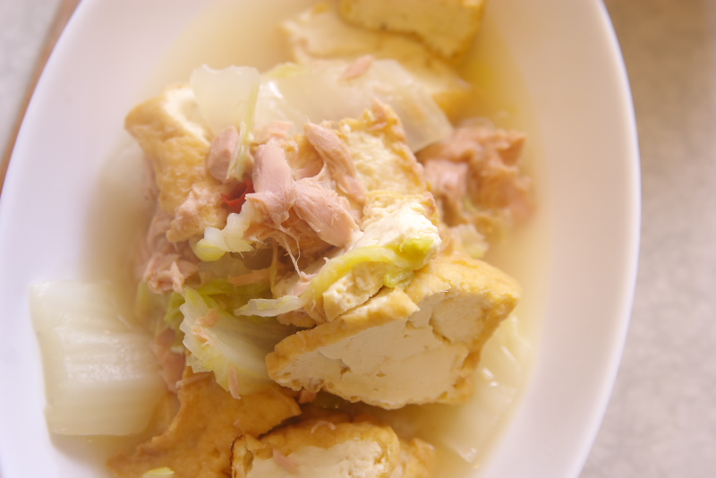 材料:白菜、厚揚げ、唐辛子、シーチキン、鯛ひしお、酒、みりん