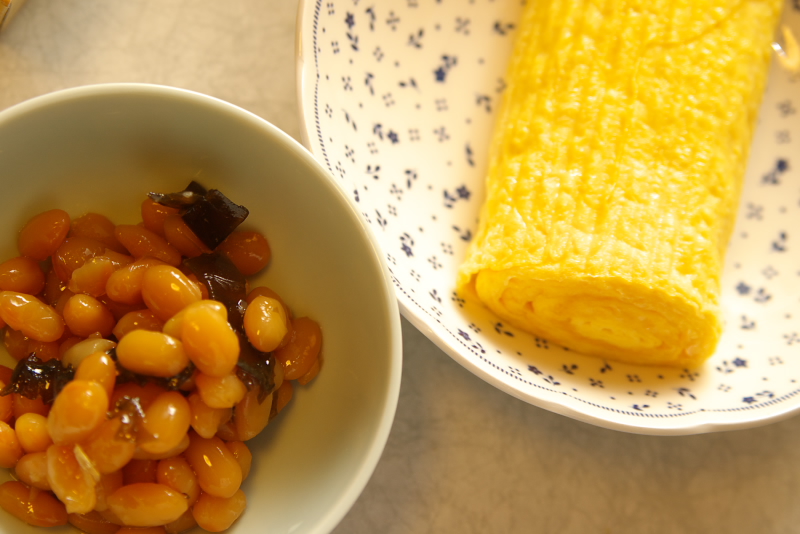 出汁巻き卵(右)と伊勢のお店『総本家貝新 水谷新九郎』さんの昆布豆(左)ガゴ。