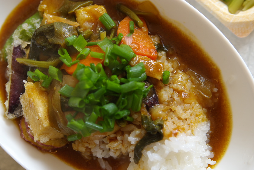 11.お皿にご飯を盛り9をのせルウをかけて香味ネギを散らしたら出来上がり。