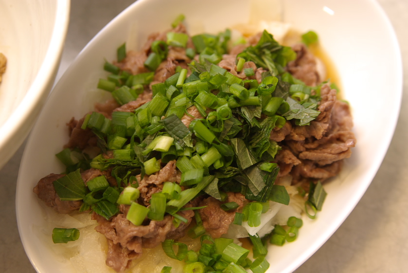 材料:牛肉、玉葱、大葉、ネギ、ポンズ、醤油、ごま油