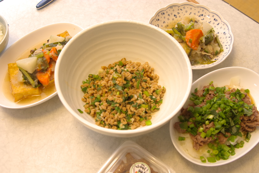 材料:鶏ムネ肉、大根、しいたけ、人参、かぶ、かぶの葉、ネギ、醤油、昆布出汁、塩、胡椒、ごま油、サラダ油、厚揚げ